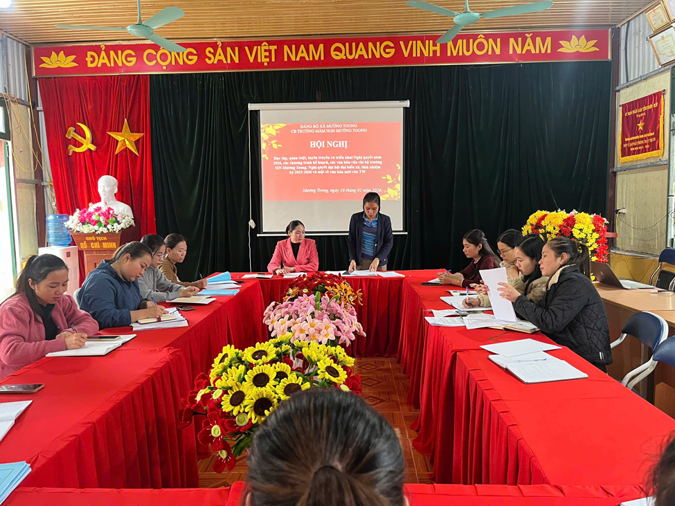 Hội nghị:Học tập, quán triệt, tuyên truyền và triển khai Nghị quyết năm 2026; các chương trình, kế hoạch, các văn bản của Chi bộ Trường MN Mường Toong; Nghị quyết Đại hội đại biểu xã, tỉnh nhiệm kỳ 2025–2030 và một số văn bản mới của Trung ương