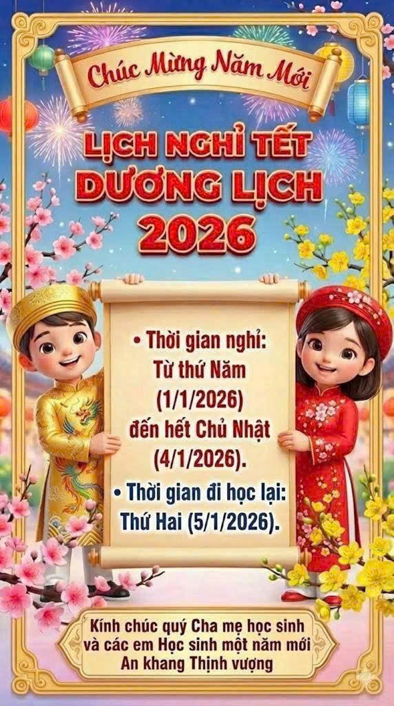 Nhà trường trân trọng thông báo đến các bậc phụ huynh và các cháu học sinh lịch nghỉ Tết Dương lịch năm 2026.