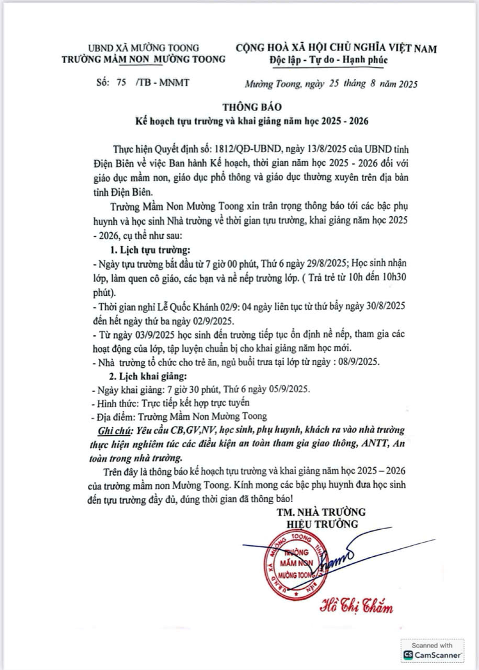 🏡 Trường mầm non Mường Toong 🏡 xin thông báo đến toàn thể quý phụ huynh 👨👩👧👦 và các em học sinh 🧑🤝🧑 về kế hoạch tựu trường 📅 và lễ khai giảng năm học 2025-2026 ✂️