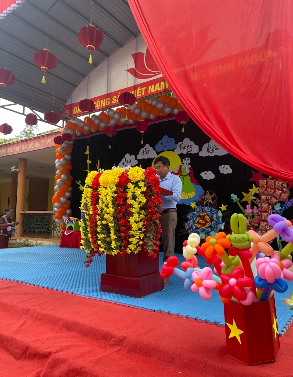 Dù bầu trời có chút mưa nhẹ, nhưng không khí trong trường vẫn ấm áp và tràn đầy tiếng cười. Khuôn viên được trang hoàng rực rỡ với đèn ông sao, mâm ngũ quả, cùng hình ảnh chị Hằng và chú Cuội tươi cười chào đón các bé. Gương mặt trẻ thơ rạng rỡ, ánh mắt long lanh niềm vui khiến mọi người như quên đi cái ẩm ướt của cơn mưa đầu thu.